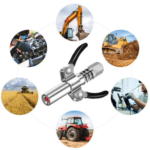 O Acoplador de Graxa XPressure é compatível com todas as pistolas e graxeiras. Ele não vaza depois de travado e não sai sob pressão.