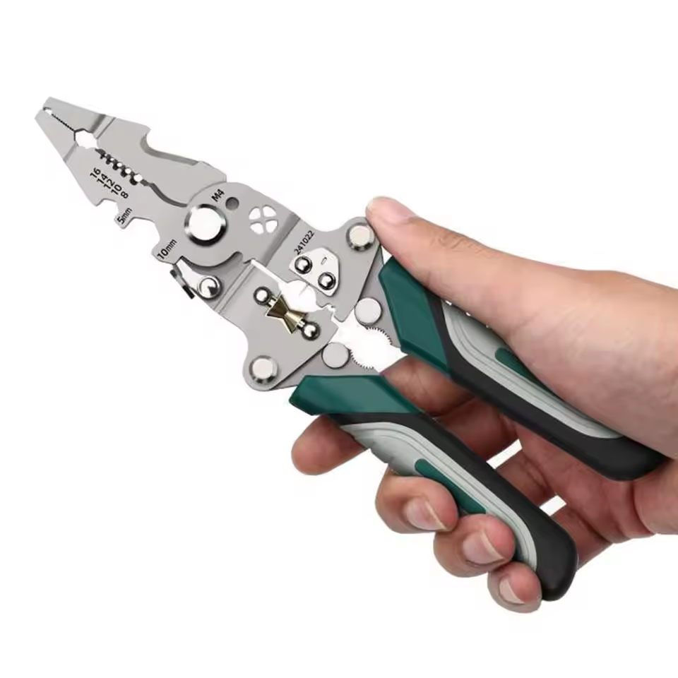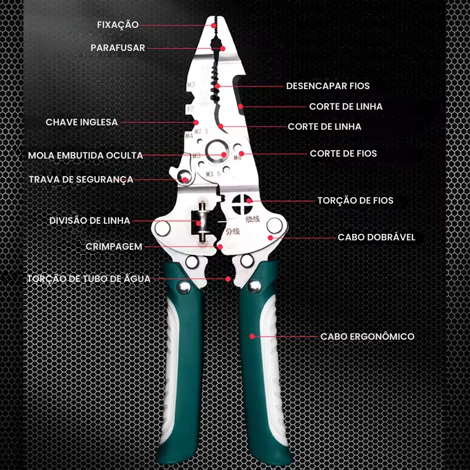 Esse alicate reúne 16 funções essenciais para o seu dia a dia: corte de fios, desencape, crimpagem, rosqueamento, torção de tubos, chave, entre outras. É a escolha ideal para eletricistas, técnicos, encanadores, mecânicos e uso doméstico.