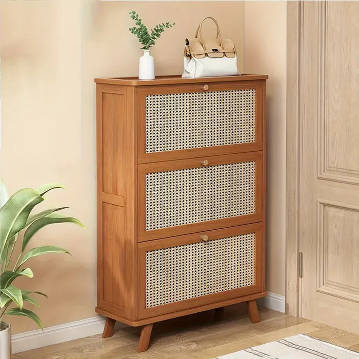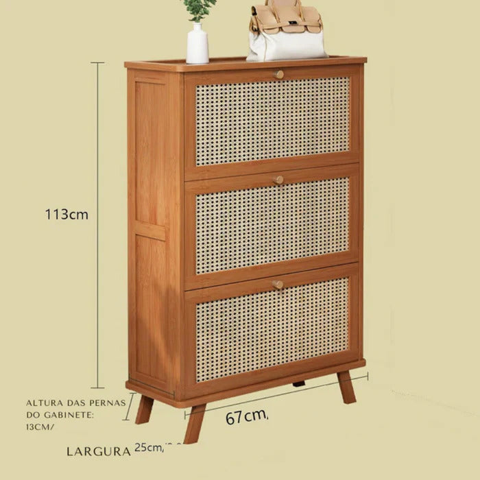 Armário de sapatos de bambu, organizador de sapateira independente com 3 gavetas basculantes e porta, armazenamento estreito de sapatos de entrada com nicho de armazenamento, armário de sapatos moderno e escondido detalhes 1